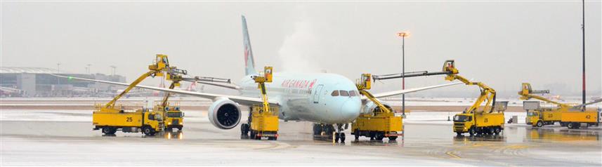 Pendant l’hiver, le glycol est nécessaire pour dégivrer les aéronefs. Le dégivrage a lieu dans notre installation centrale de dégivrage, qui est responsable de la majorité de l’entreposage et de la pulvérisation de nos aéronefs. Une structure de polyéthylène haute densité recouvre l’ensemble de l’installation afin de recueillir tout liquide coulant de la surface