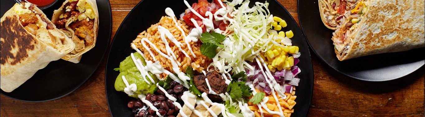 Burritos copieux remplis de porc, de poulet carne asada chorizo ou conchinita, de riz, de haricots, de crème sure, de fromage et d’autres ingrédients frais. Des choix de plats végétariens sont disponibles.